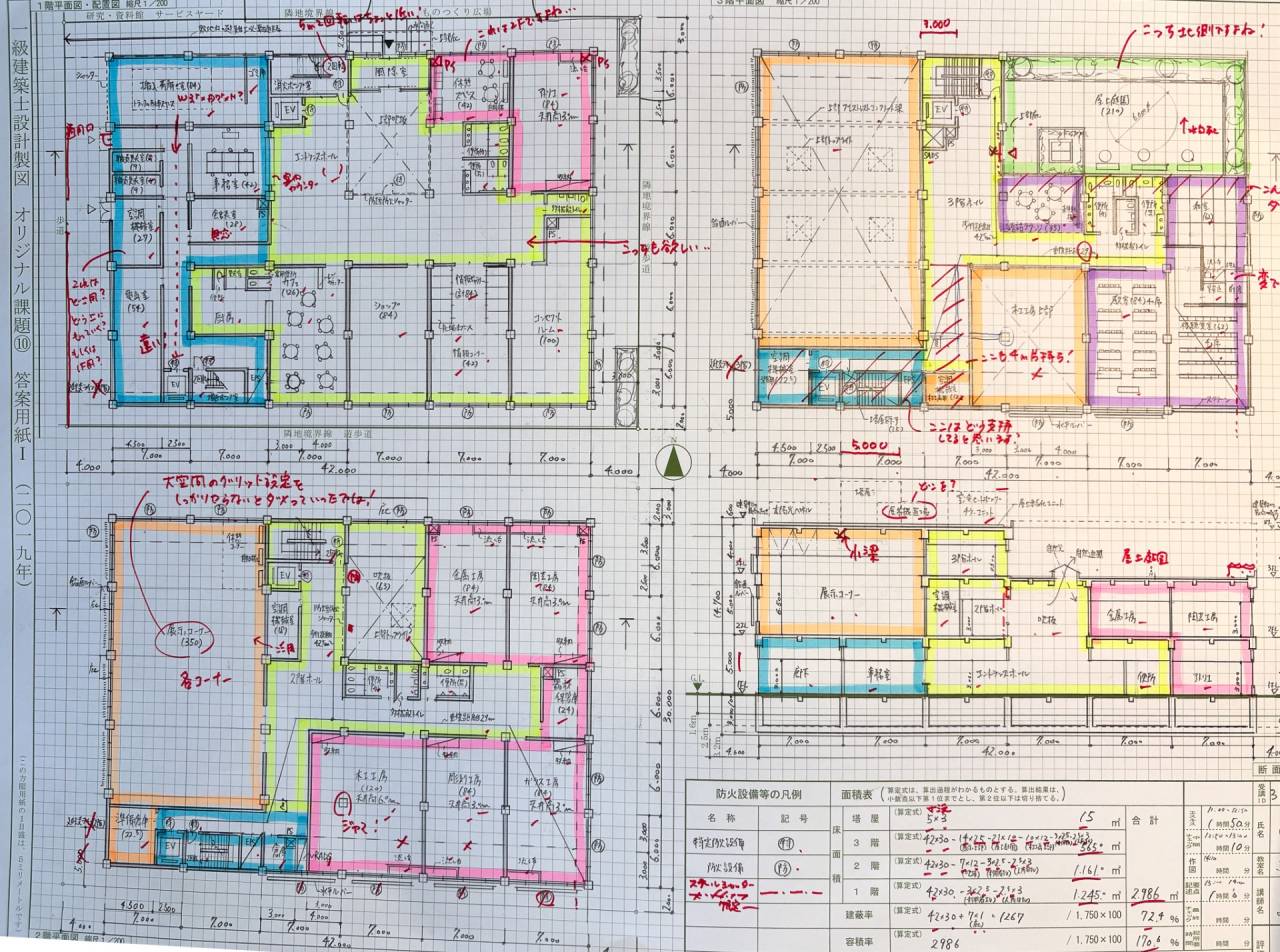 お題は7月に発表されますが(今年は庁舎)、道、敷地の大きさ、部屋の規模と数、方角などは当日まで何がでるかわかりません。それを6時間半で真っ白の状態からプラン、作図まで終わらせなくちゃいけないので荒行以外の何物でもないのです。しかも試験は手描き。