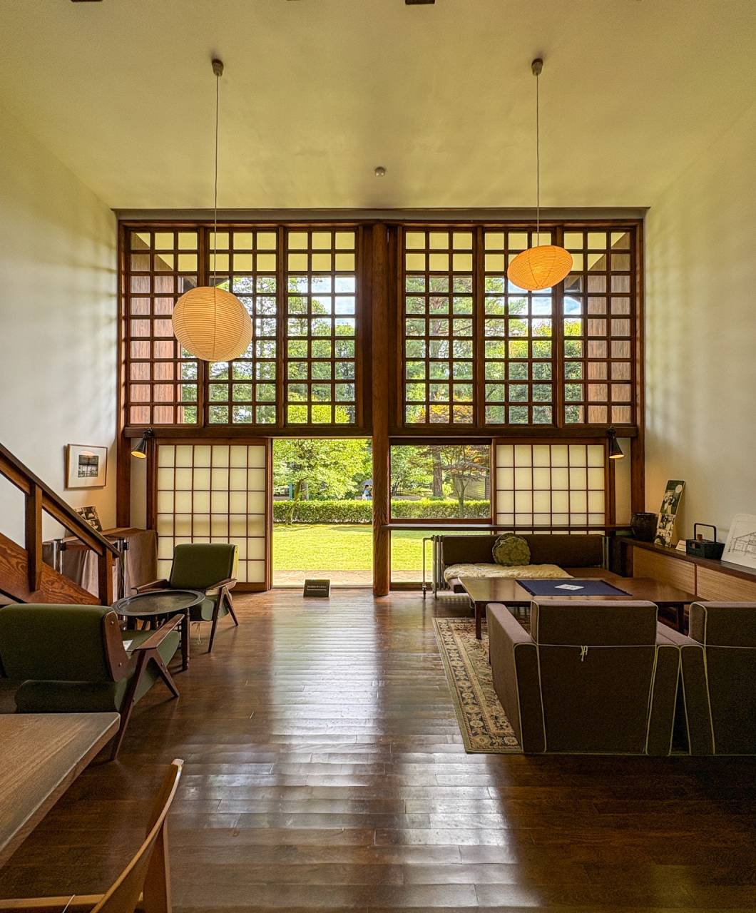 当時は日中戦争の激化で「木造建物建築統制規則」により延床面積を100㎡以下とする制限があったため、高さが得られる建物中央を吹き抜けにして大空間を造ったらしいです。